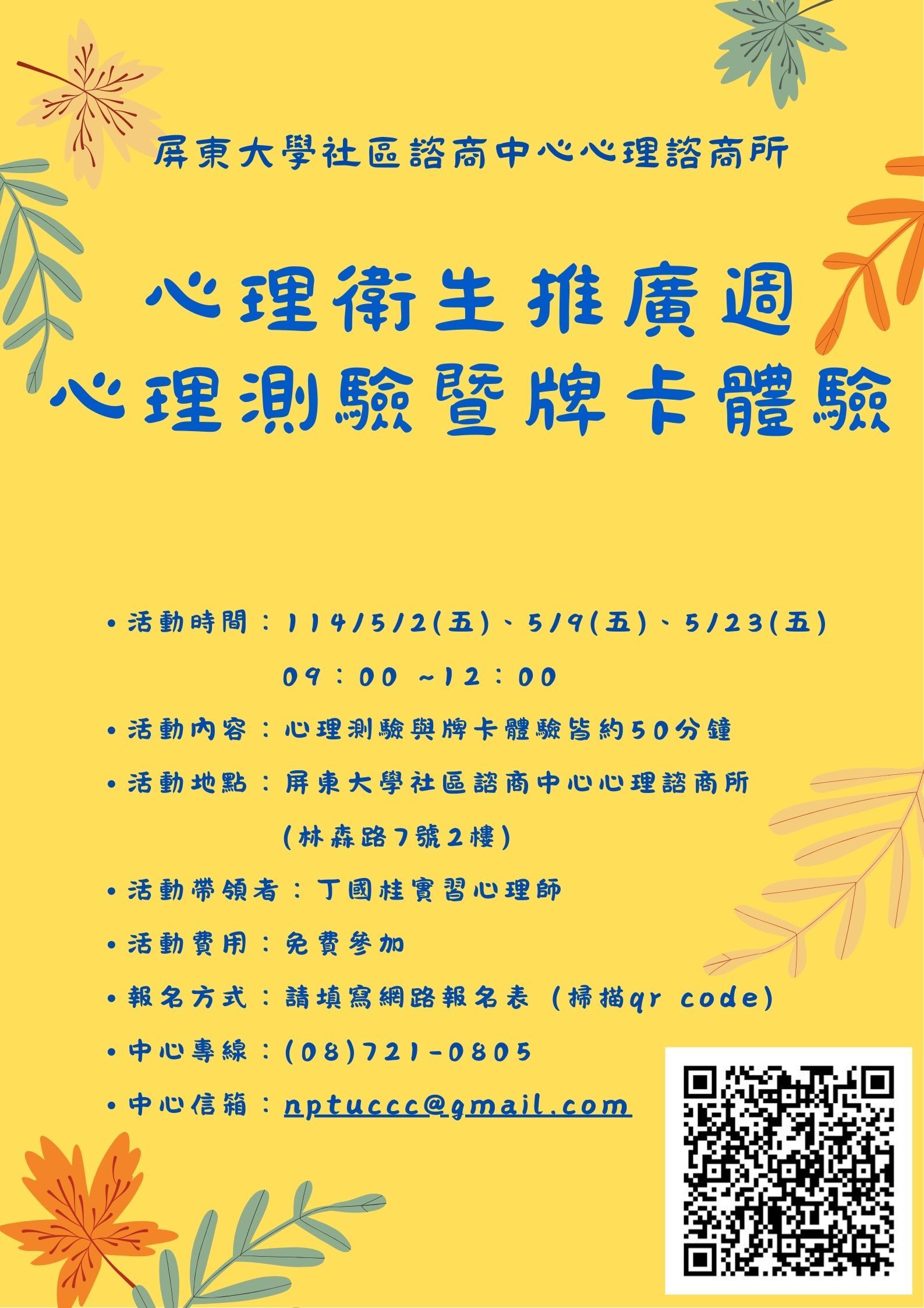 📍 活動地點:國立屏東大學社區諮商中心心理諮商所